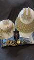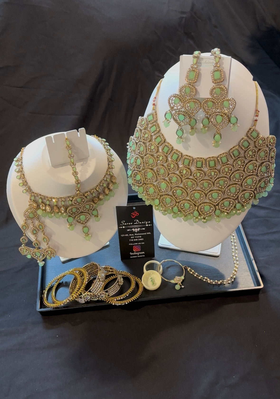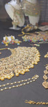 5 Piece Half Bridal Jewelry Set includes necklace, pair of jhumkas, a bridal tikka, jhoomar, and a nose ring. Watch entire video to see all the colors!