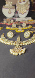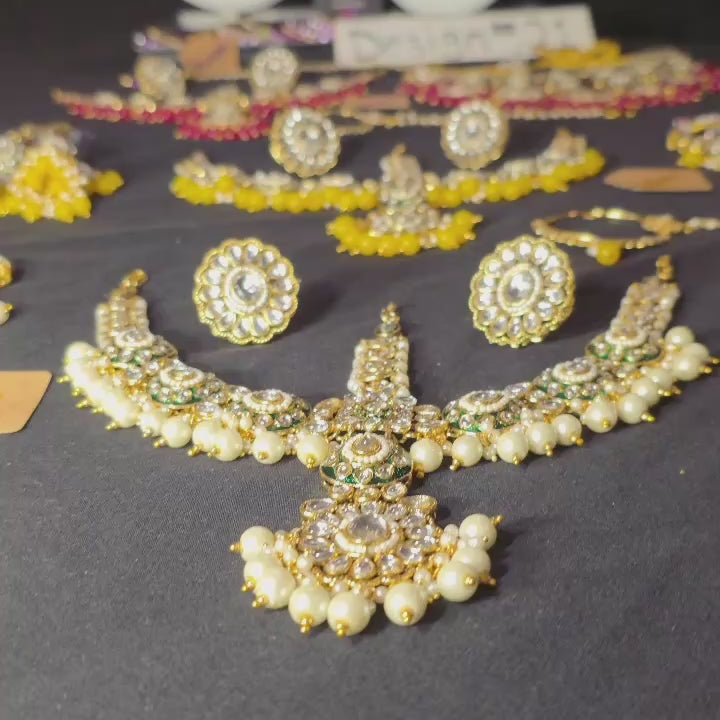 6 Piece Half Bridal Jewelry Set includes necklace, pair of jhumkas, bridal tikka, nose ring, and 2 adjustable rings. Watch entire video to see all the colors!