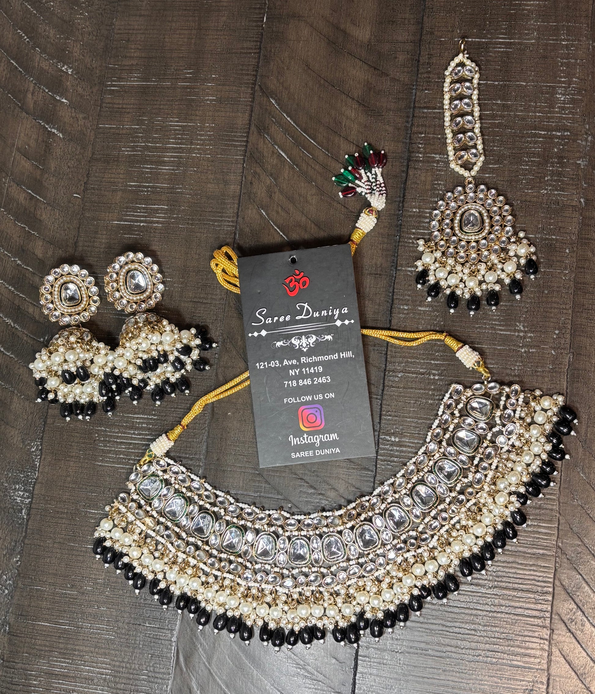 3 Piece Jewelry Set includes necklace, pair of jhumkas, and tikka.